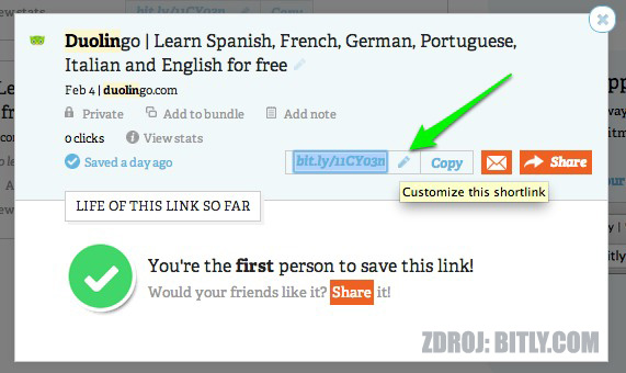 Nově vytvořený odkaz nalezneme pod záložkou Bitmarks, kde jsou různé podrobnosti jako statistiky, sdílení, nadpis, ale především políčko se zkrácenou adresou. Klikněte na tužku vedle políčka, upravte text odkazu a opět potvrďte stiskem enter. Jednoduché. Hotovo!